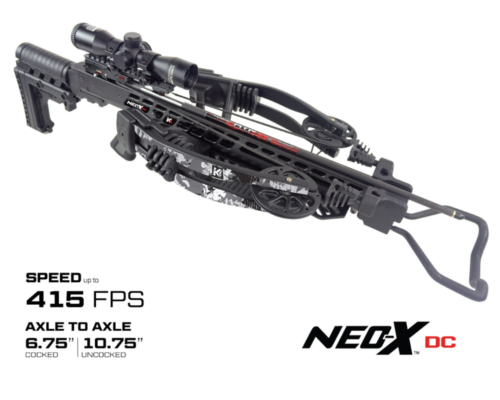 The NEO-X features the patent-pending DC Triggerbox, allowing users to safely and easily decock the crossbow by hand—no shooting required. Paired with the easy-to-draw, synchronized X-Cam™ system, the NEO-X measures just 10.75 inches uncocked and an ultra-narrow 6.75 inches cocked, while delivering speeds up to 415 feet per second.