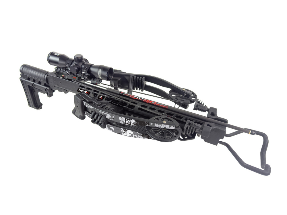 The NEO-X package includes two premium 20-inch, 390-grain Hypr™ bolts with the new V-Track nock, an illuminated Lumix XLR 4×32 scope, sled rope cocker, three-arrow quiver, and rail lube.